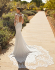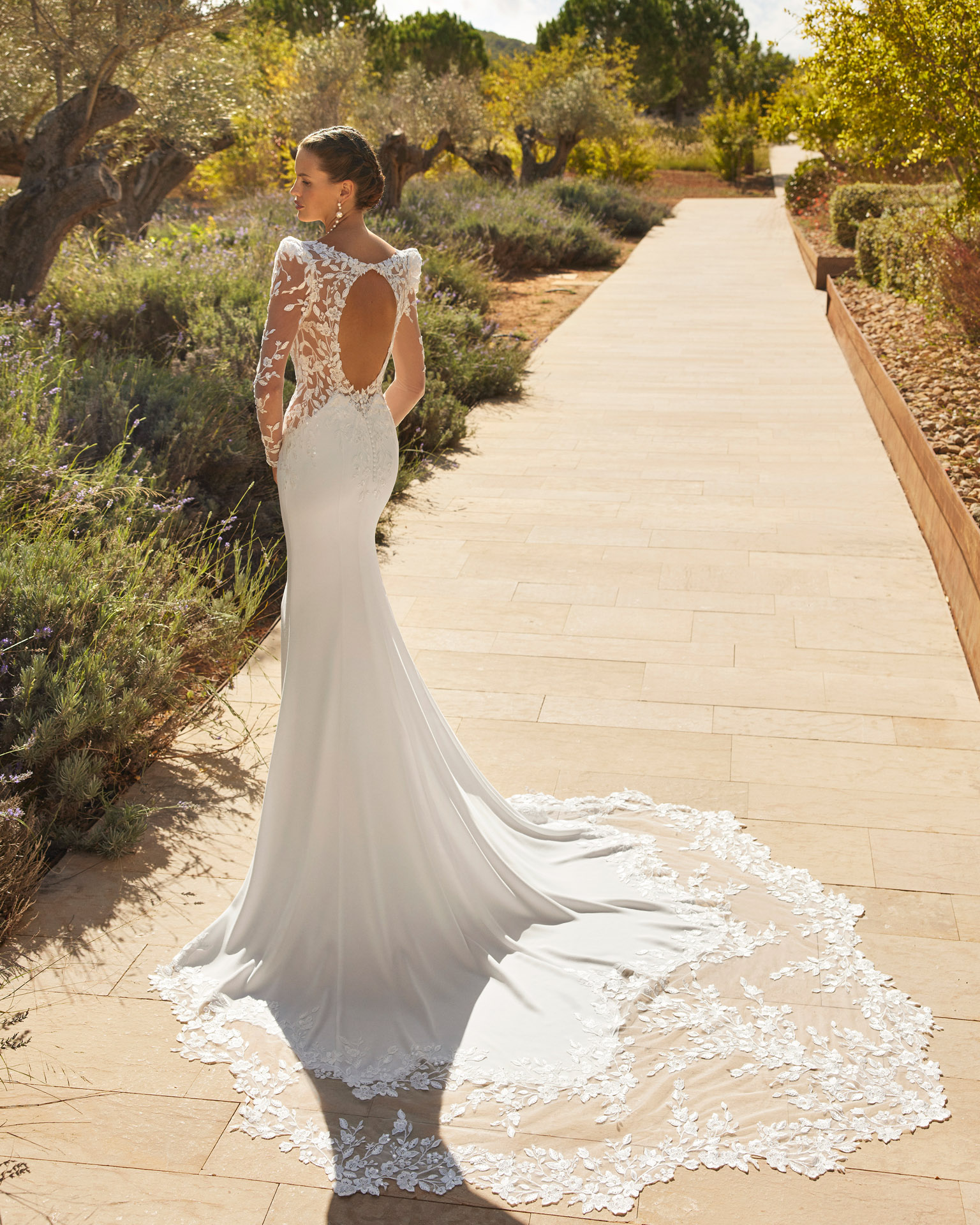 Abito da sposa lungo a sirena in crêpe bielastico con corpetto in pizzo, perline, scollatura profonda, maniche rimovibili, schiena scoperta e strascico in pizzo.